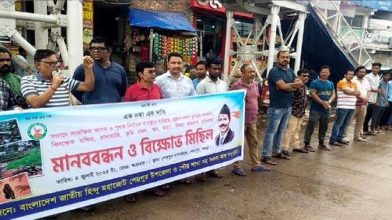 শুক্রবার (৪ জুলাই) বেলা সোয়া ১১টায় জাতীয় হিন্দু মহাজোটের শেরপুর উপজেলা ও পৌর কমিটির উদ্যোগে ঢাকা-বগুড়া মহাসড়কের শহরের পদচারী সেতুর নিচে এ মানববন্ধনের আয়োজন করে।