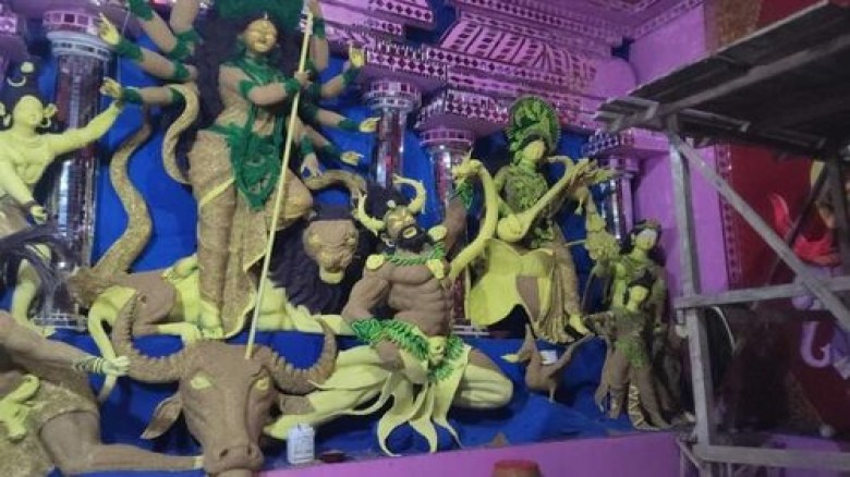 গত চার বছর ধরে এ মন্দিরে প্রতিমা তৈরির কাজ করে আসা রাজিব বলছেন, এ বছর দুর্গা পূজায় বিশেষ আকর্ষণ হিসেবে ধান দিয়ে প্রতিমা গড়ছেন তিনি।